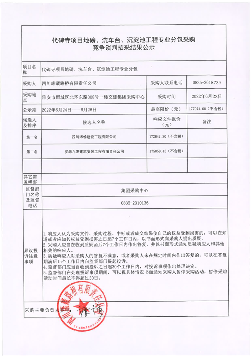 四川康藏路橋有限責(zé)任公司代碑寺項(xiàng)目地磅、洗車臺(tái)、沉淀池工程專業(yè)分包采購(gòu)競(jìng)爭(zhēng)談判招采結(jié)果公示