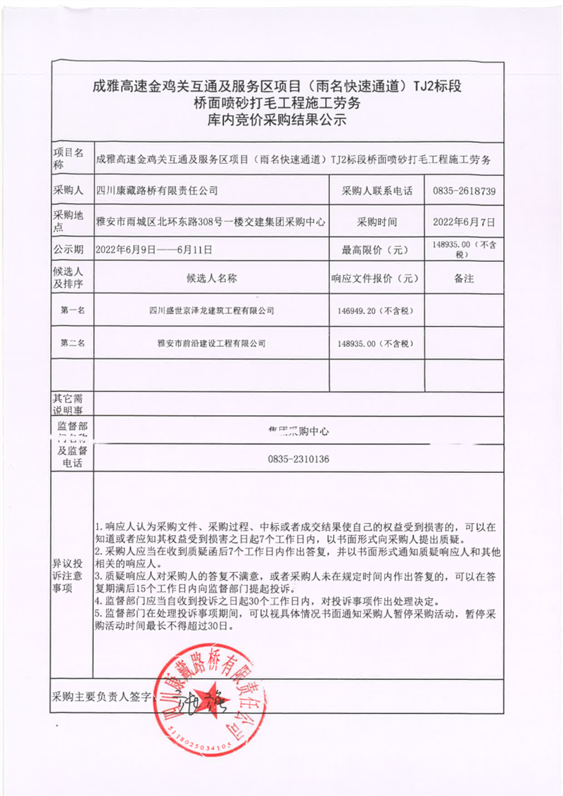 四川康藏路橋有限責(zé)任公司成雅高速金雞關(guān)互通服務(wù)區(qū)項(xiàng)目(雨名快速通道)TJ2標(biāo)段橋面噴砂打毛工程施工勞務(wù)庫內(nèi)競(jìng)價(jià)采購結(jié)果公示