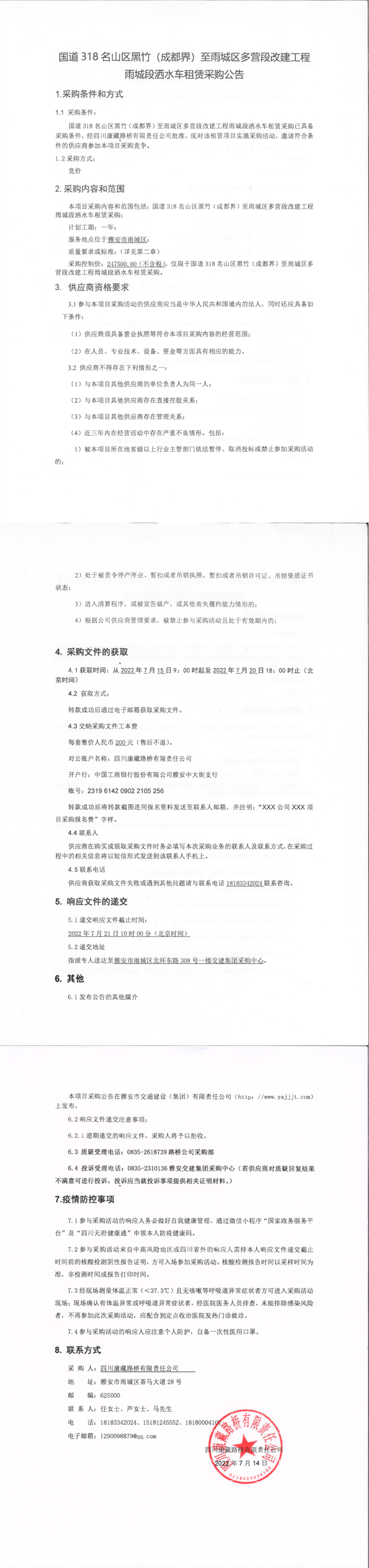 四川康藏路橋有限責任公司國道318名山區(qū)黑竹(成都界)至雨城區(qū)多營段改建工程雨城段灑水車租賃采購公告