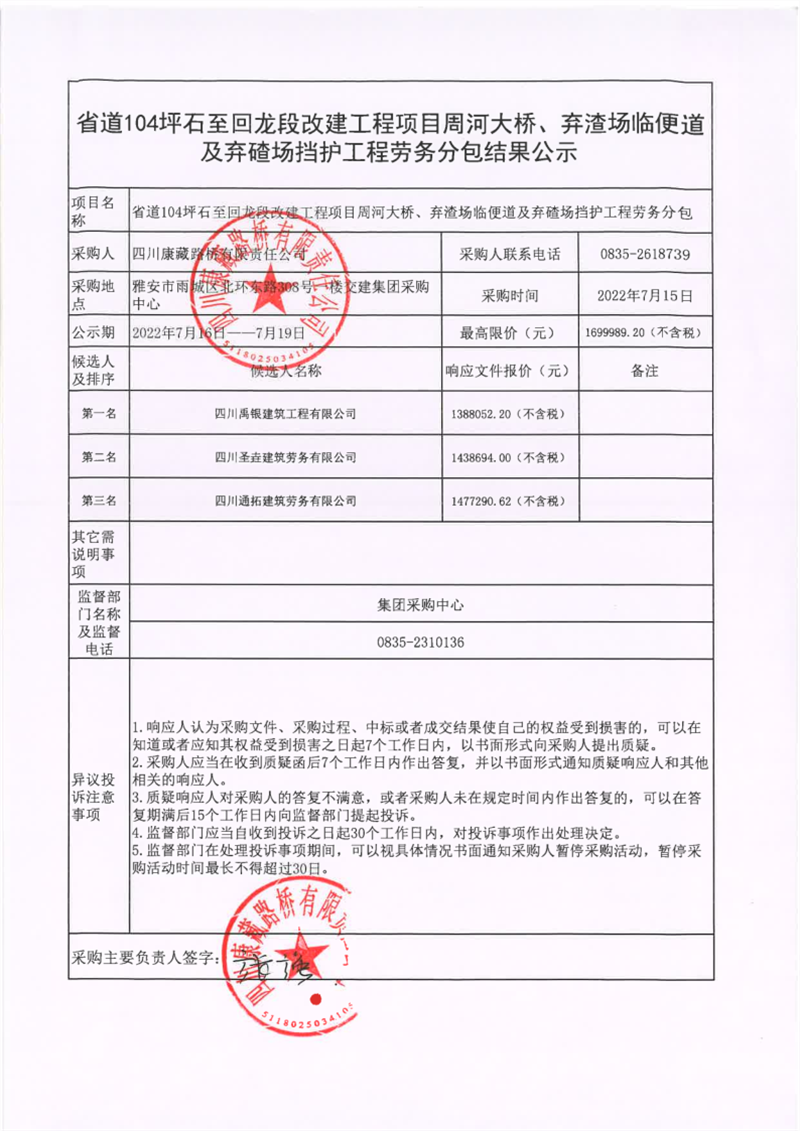 四川康藏路橋有限責(zé)任公司省道104坪石至回龍段改建工程項(xiàng)目周河大橋、棄渣場臨便道及棄碴場擋護(hù)工程勞務(wù)分包結(jié)果公示