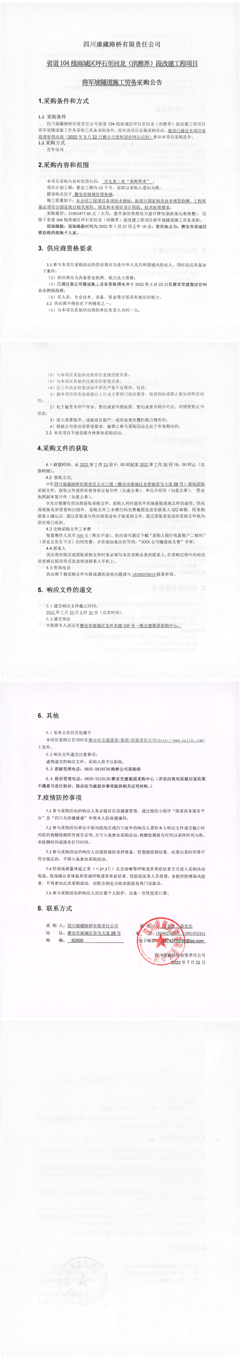 四川康藏路橋有限責任公司省道104線雨城區(qū)坪石至回龍(洪雅界)段改建工程項目將軍坡隧道施工勞務采購公告
