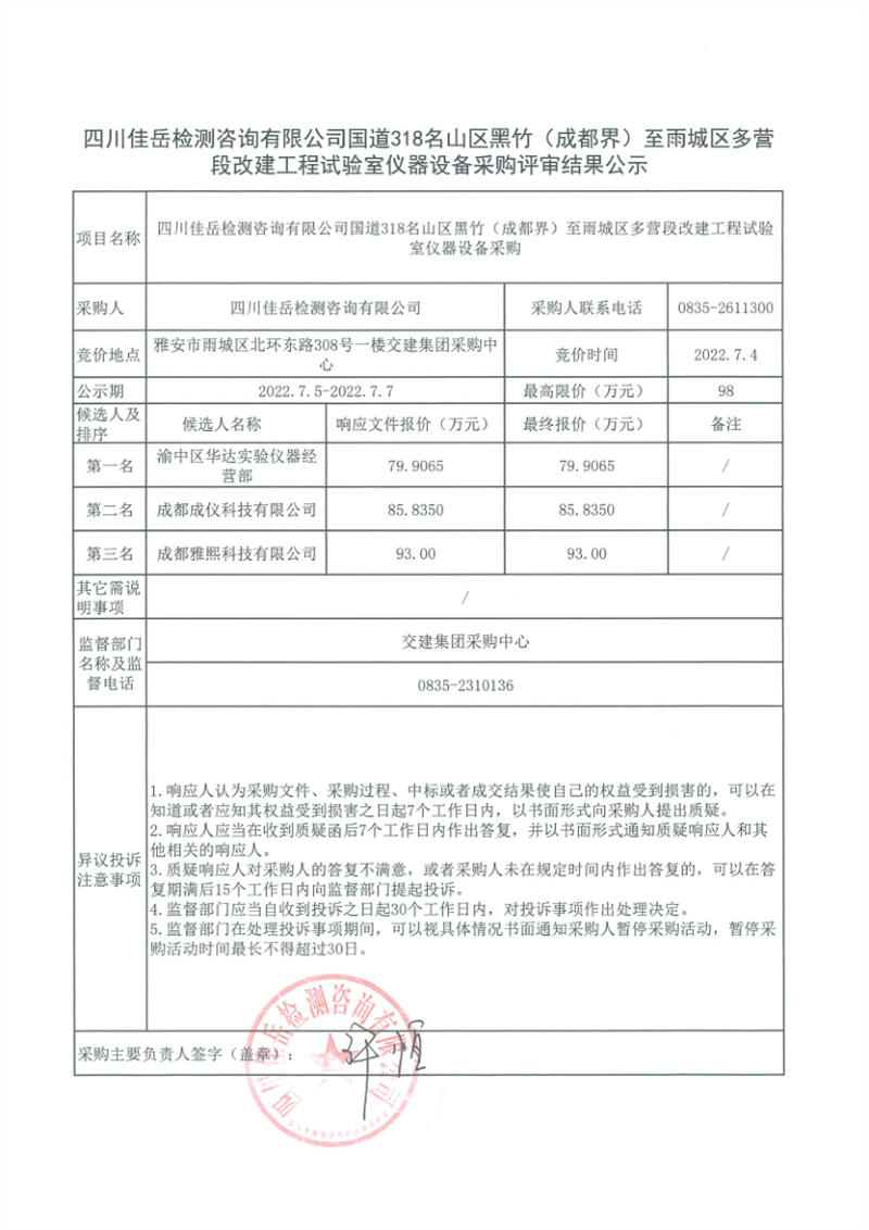 四川佳岳檢測咨詢有限公司國道318名山區(qū)黑竹(成都界)至雨城區(qū)多營段改建工程試驗室儀器設(shè)備采購評審結(jié)果公示