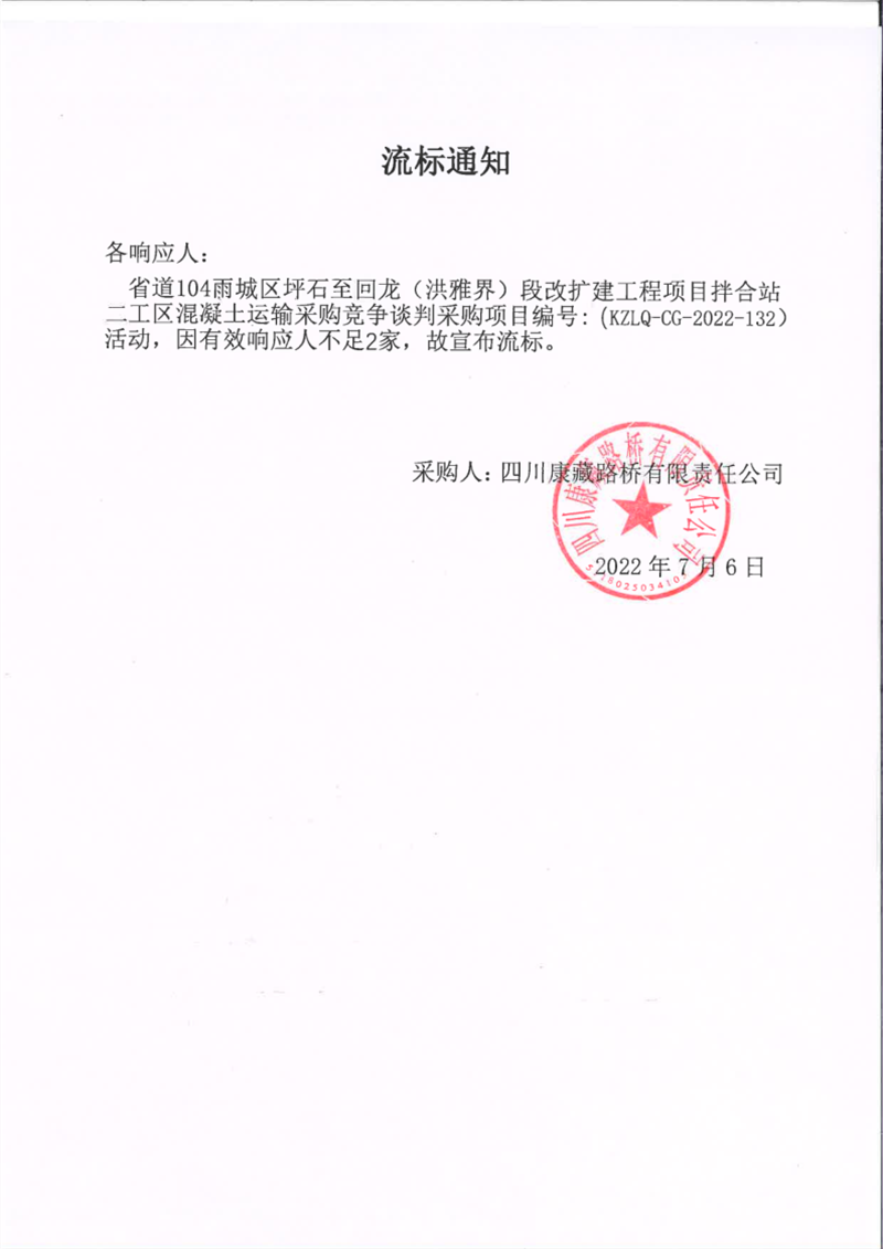 四川康藏路橋有限責(zé)任公司省道104線雨城區(qū)坪石至回龍(洪雅界)段改建工程項目拌合站二工區(qū)混凝土運輸采購競爭談判采購項目流標(biāo)通知