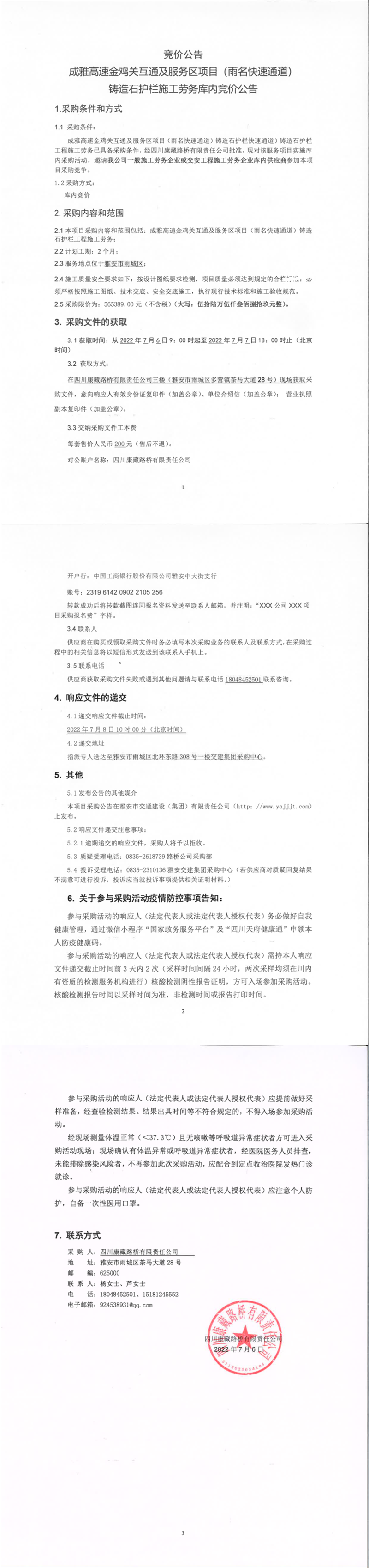 四川康藏路橋有限責(zé)任公司成雅高速金雞關(guān)互通及服務(wù)區(qū)項目(雨名快速通道)鑄造石護欄施工勞務(wù)庫內(nèi)競價公告