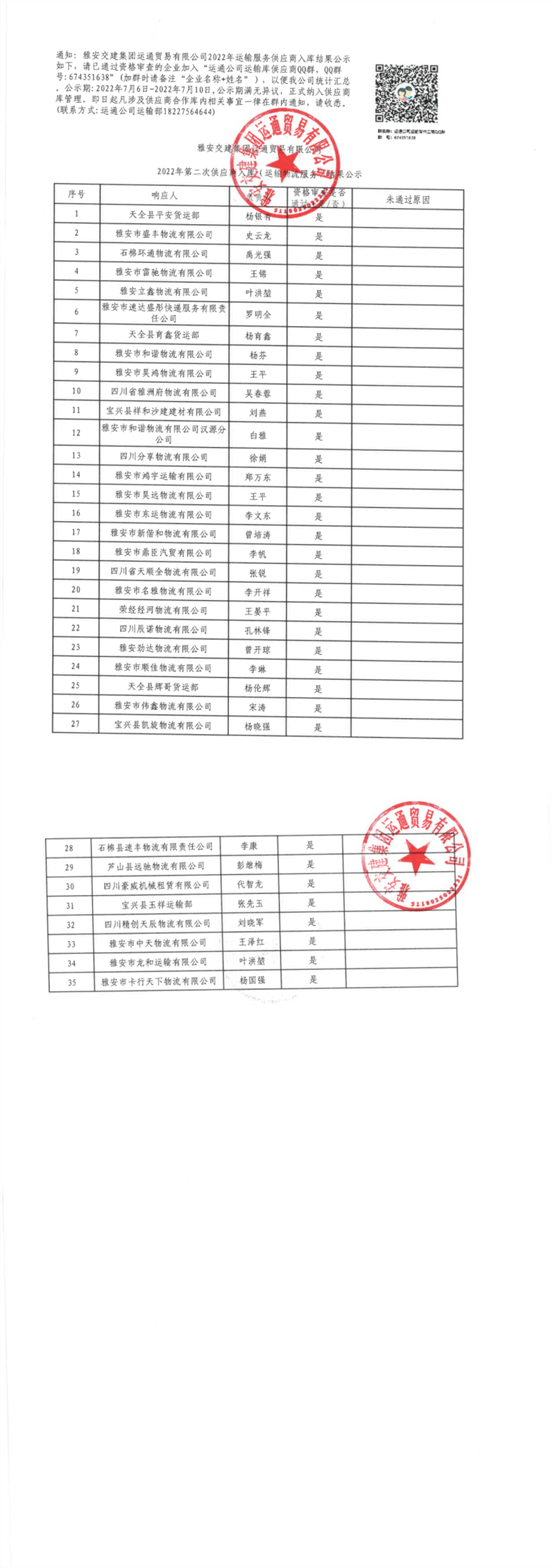 雅安交建集團(tuán)運(yùn)通貿(mào)易有限公司2022年第二次供應(yīng)商入庫(運(yùn)輸物流服務(wù))結(jié)果公示