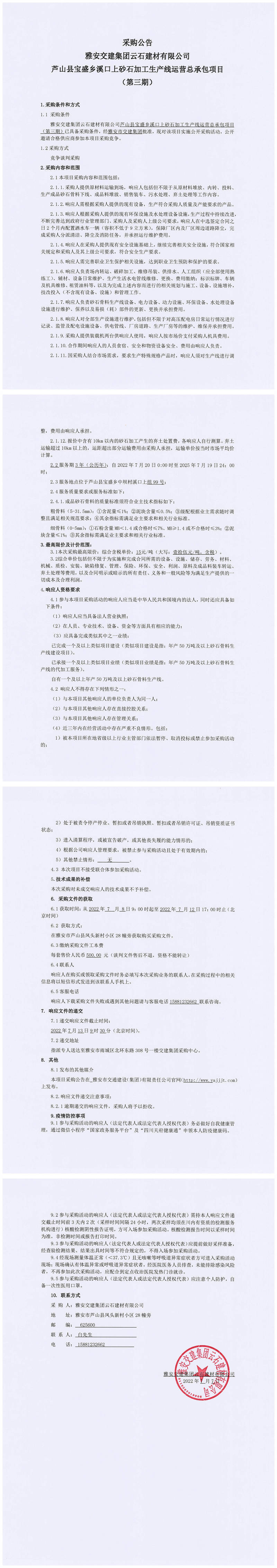 雅安交建集團(tuán)云石建材有限公司蘆山縣寶盛鄉(xiāng)溪口上砂石加工生產(chǎn)線(xiàn)運(yùn)營(yíng)總承包項(xiàng)目(第三期)采購(gòu)公告