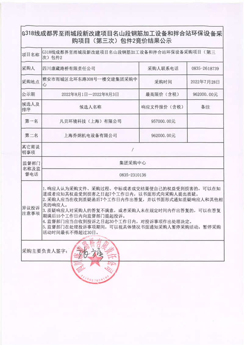 四川康藏路橋有限責任公司G318線成都界至雨城段新改建項目名山段鋼筋加工設備和拌合站環(huán)保設備采購項目(第三次)包件2競價結果公示