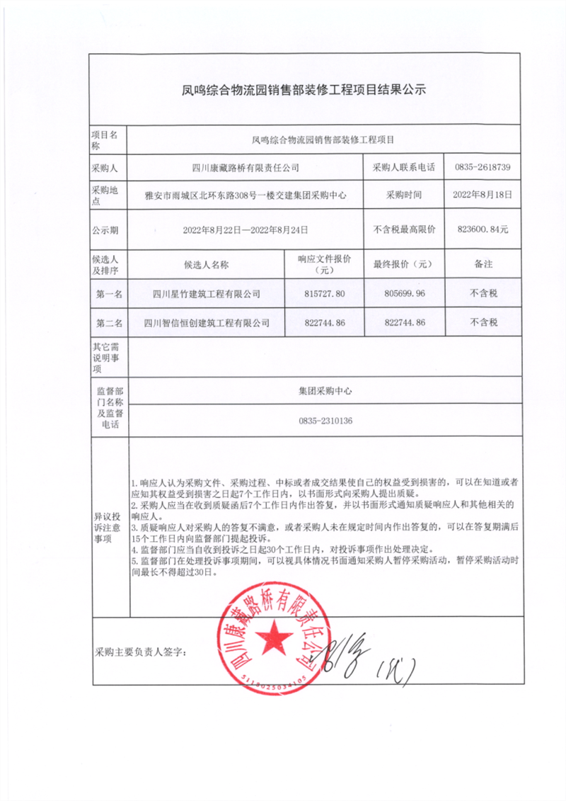四川康藏路橋有限責(zé)任公司鳳鳴綜合物流園銷售部裝修工程項目結(jié)果公示