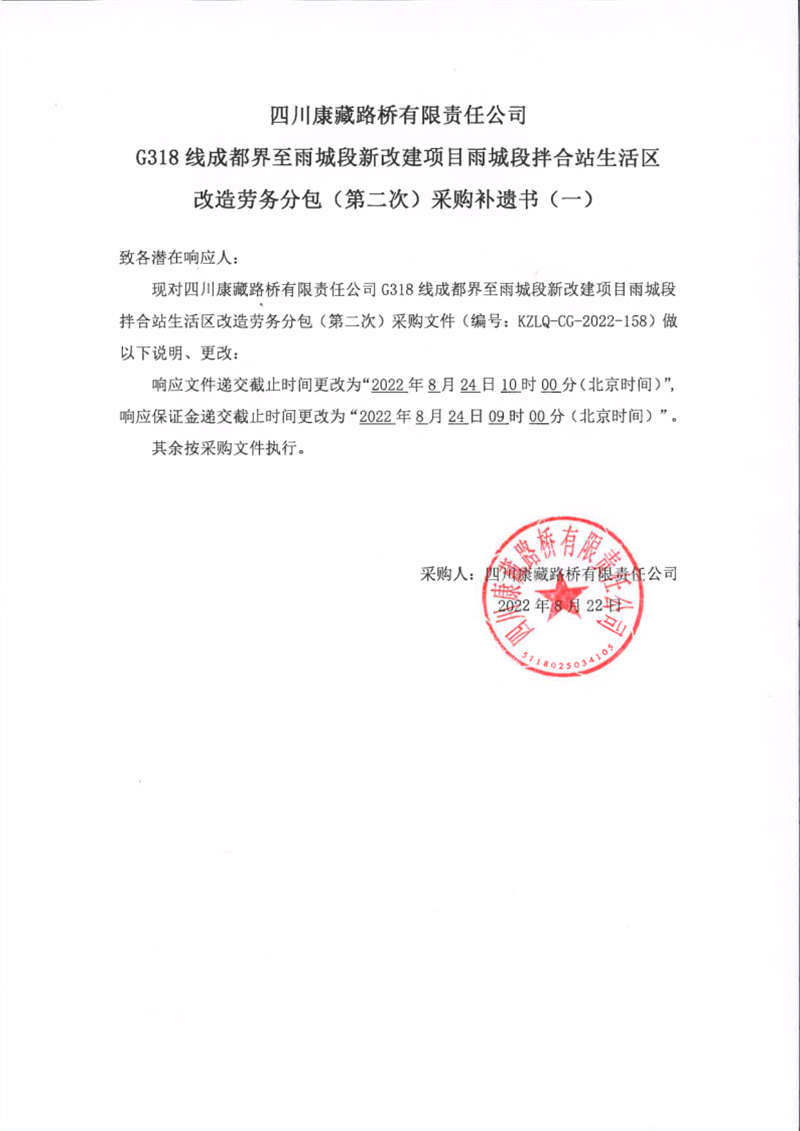 四川康藏路橋有限責(zé)任公司G318線成都界至雨城段新改建項(xiàng)目雨城段拌合站生活區(qū)改造勞務(wù)分包(第二次)采購(gòu)補(bǔ)遺書(shū)(一)