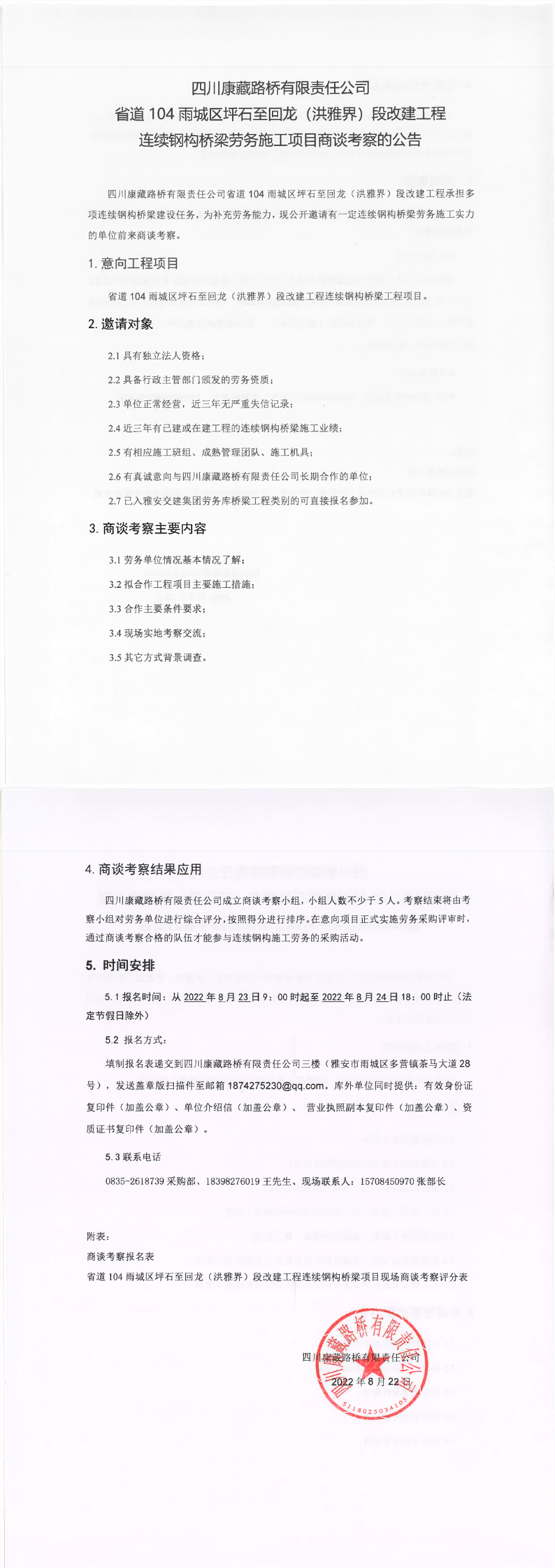 四川康藏路橋有限責(zé)任公司省道104雨城區(qū)坪石至回龍(洪雅界)段改建工程連續(xù)鋼構(gòu)橋梁勞務(wù)施工項目商談考察的公告
