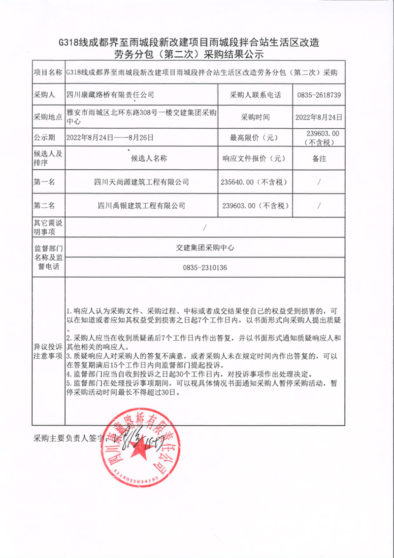 四川康藏路橋有限責(zé)任公司G318線成都界至雨城段新改建項(xiàng)目雨城段拌合站生活區(qū)改造勞務(wù)分包(第二次)采購(gòu)結(jié)果公示