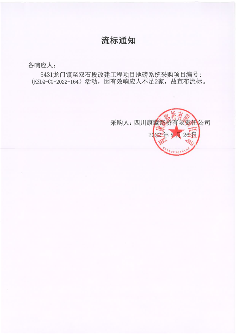 四川康藏路橋有限責(zé)任公司S431龍門(mén)鎮(zhèn)至雙石段改建工程項(xiàng)目地磅系統(tǒng)采購(gòu)項(xiàng)目流標(biāo)通知