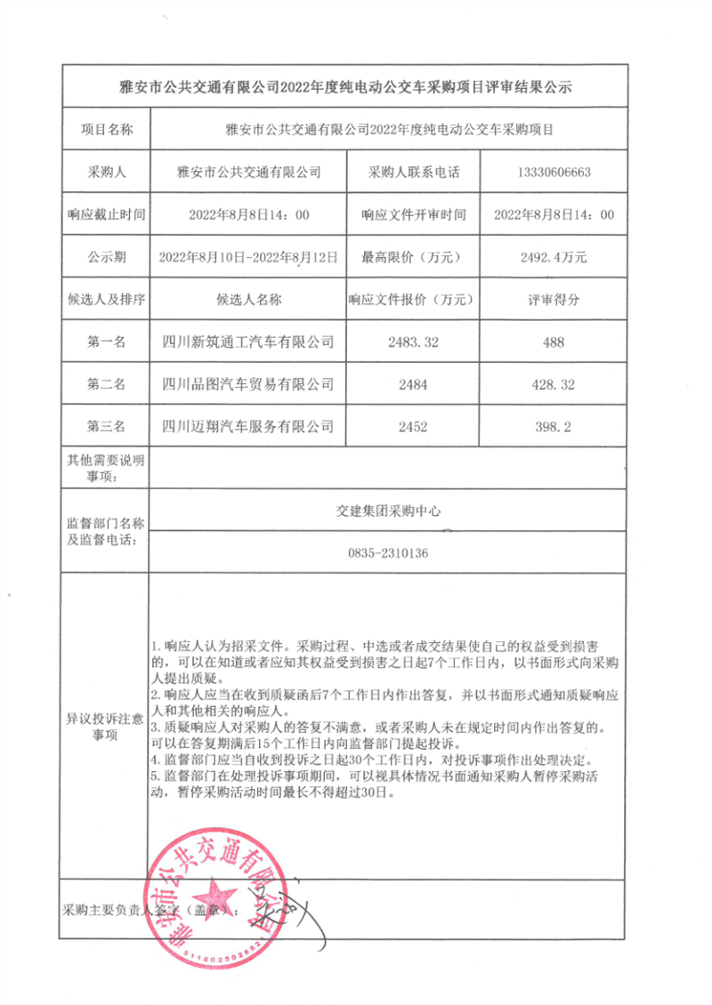 雅安市公共交通有限公司2022年度純電動公交車采購項目評審結(jié)果公示