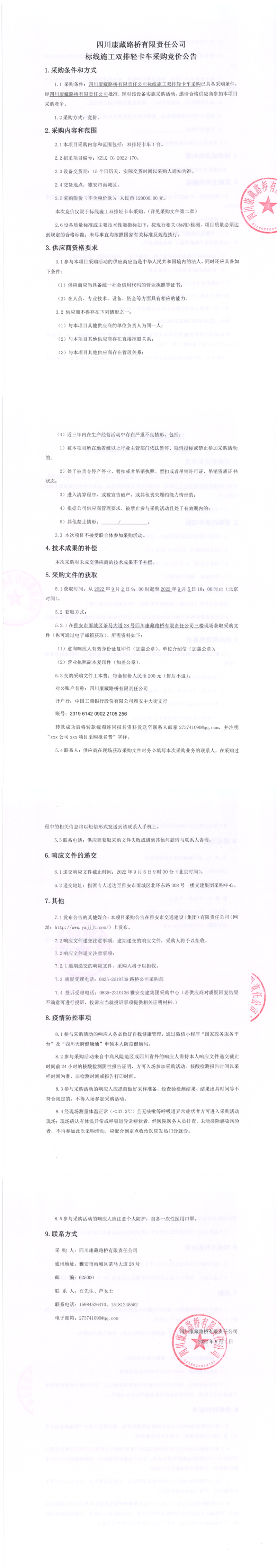 四川康藏路橋有限責(zé)任公司標(biāo)線施工雙排輕卡車采購競價(jià)公告