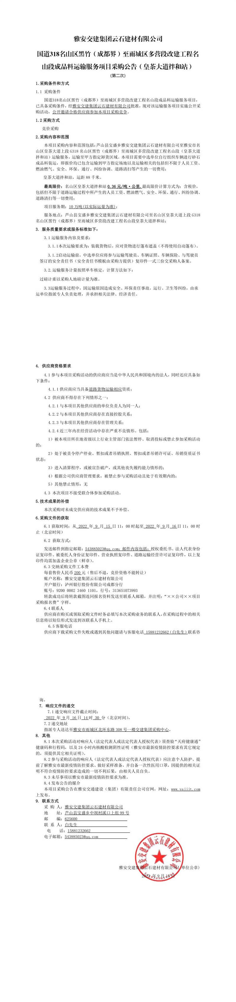 雅安交建集團(tuán)云石建材有限公司國(guó)道318名山區(qū)黑竹(成都界)至雨城區(qū)多營(yíng)段改建工程名山段成品料運(yùn)輸服務(wù)項(xiàng)目采購(gòu)公告(皇茶大道拌和站)