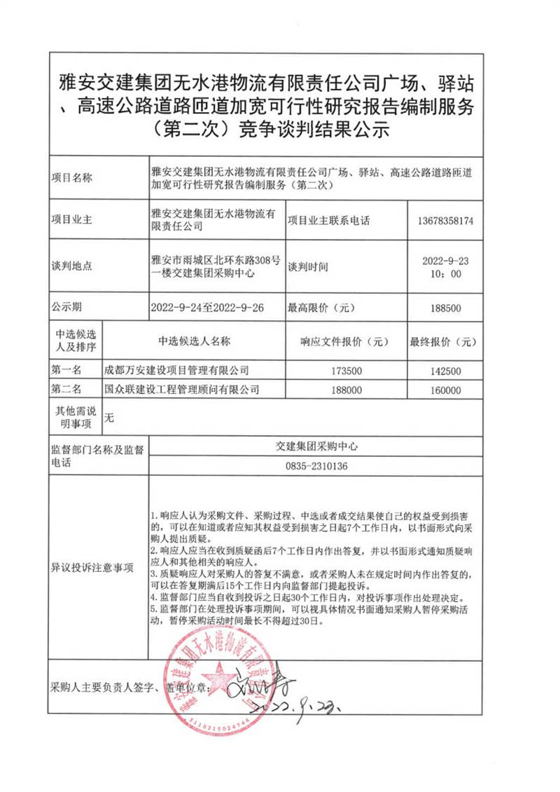 雅安交建集團(tuán)無水港物流有限責(zé)任公司廣場、驛站、高速公路道路匝道加寬可行性研究報(bào)告編制服務(wù)(第二次)競爭談判結(jié)果公示
