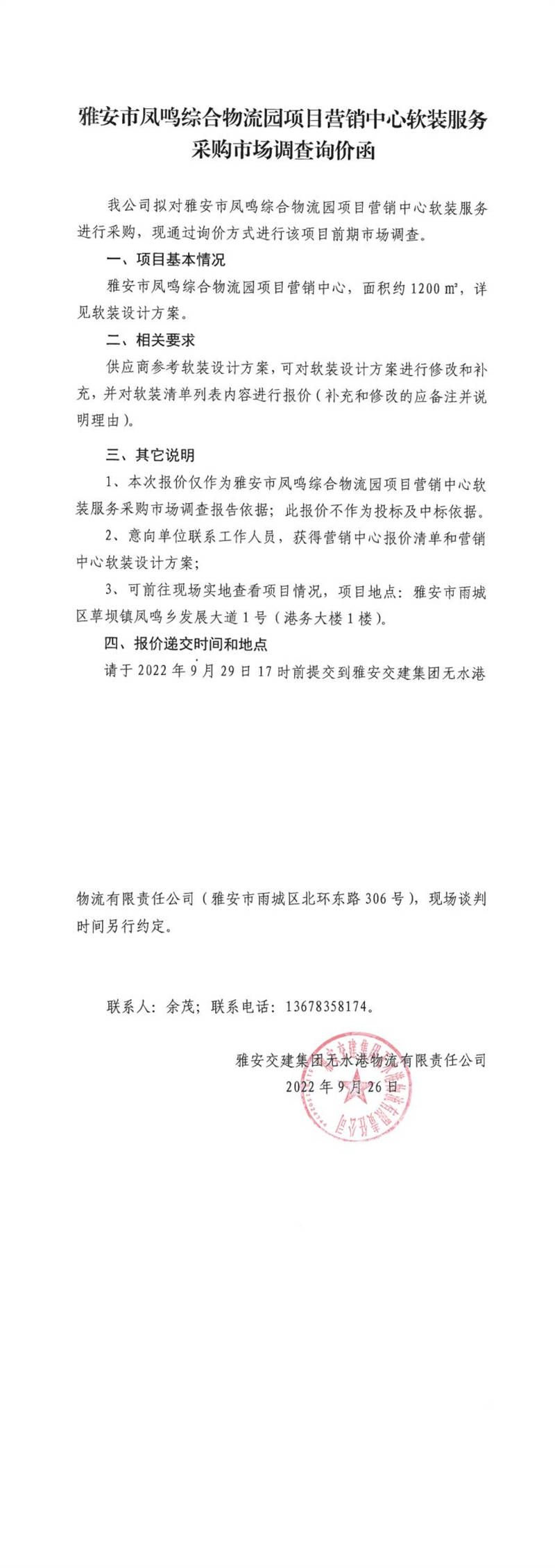 雅安交建集團(tuán)無(wú)水港物流有限責(zé)任公司雅安市鳳鳴綜合物流園項(xiàng)目營(yíng)銷中心軟裝服務(wù)采購(gòu)市場(chǎng)調(diào)查詢價(jià)函