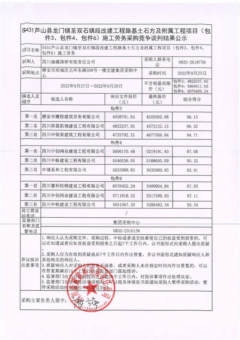 四川康藏路橋有限責(zé)任公司S431蘆山縣龍門鎮(zhèn)至雙石鎮(zhèn)段改建工程路基土石方及附屬工程項(xiàng)目(包件3、包件4、包件6)施工勞務(wù)采購(gòu)競(jìng)爭(zhēng)談判結(jié)果公示