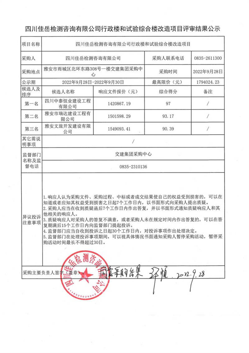 四川佳岳檢測咨詢有限公司行政樓和試驗(yàn)綜合樓改造項(xiàng)目評(píng)審結(jié)果公示