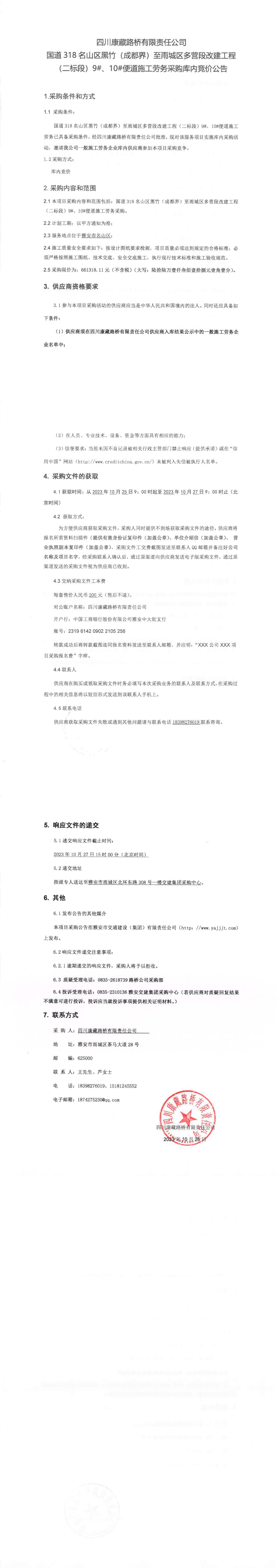 四川康藏路橋有限責任公司國道318名山區(qū)黑竹(成都界)至雨城區(qū)多營段改建工程(二標段)9#、10#便道施工勞務采購庫內(nèi)競價公告