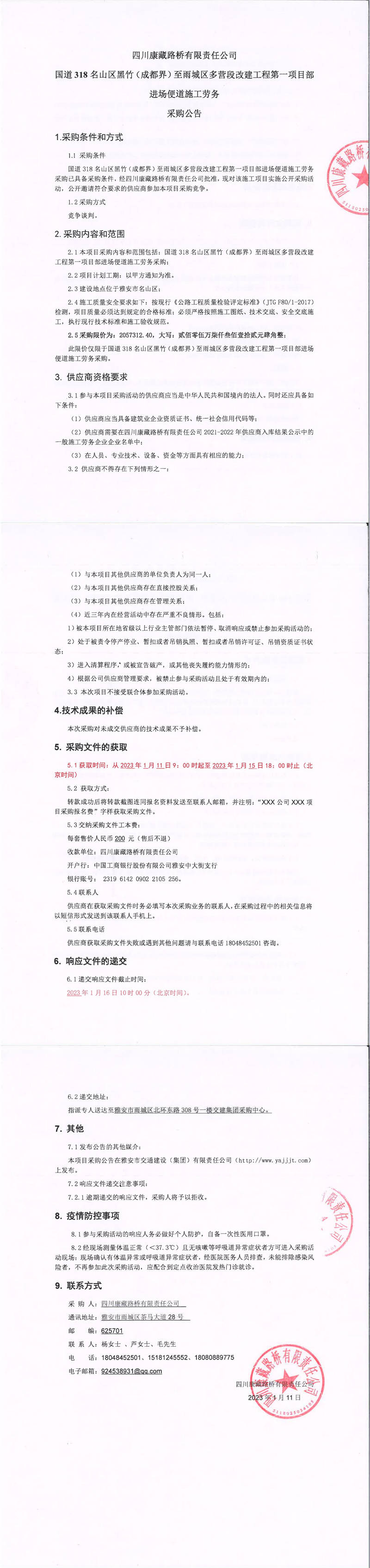 四川康藏路橋有限責(zé)任公司國道318名山區(qū)黑竹(成都界)至雨城區(qū)多營段改建工程第一項(xiàng)目部進(jìn)場便道施工勞務(wù)采購公告