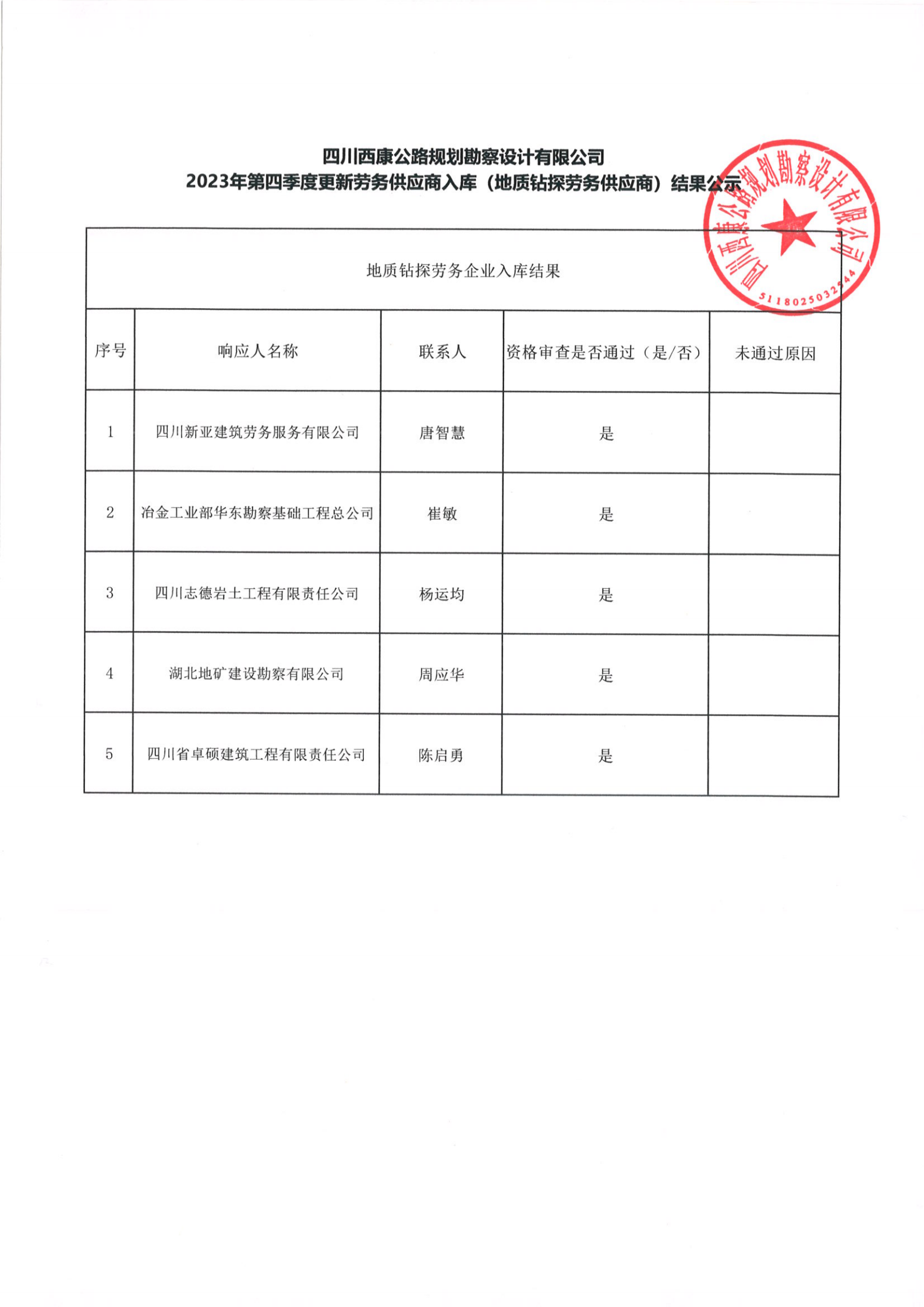四川西康公路規(guī)劃勘察設計有限公司2023年第四季度更新勞務供應商入庫(地質(zhì)鉆探勞務供應商)結(jié)果公示