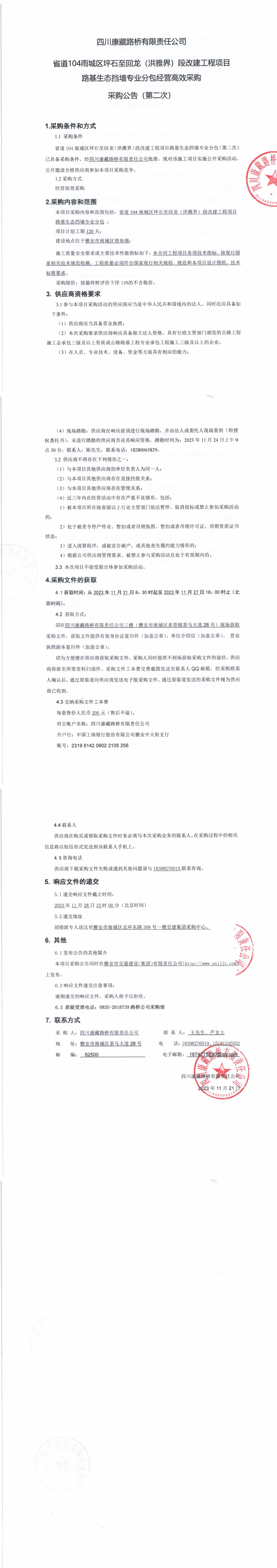 四川康藏路橋有限責(zé)任公司省道104雨城區(qū)坪石至回龍(洪雅界)段改建工程項(xiàng)目路基生態(tài)擋墻專業(yè)分包經(jīng)營(yíng)高效采購(gòu)(第二次)采購(gòu)公告
