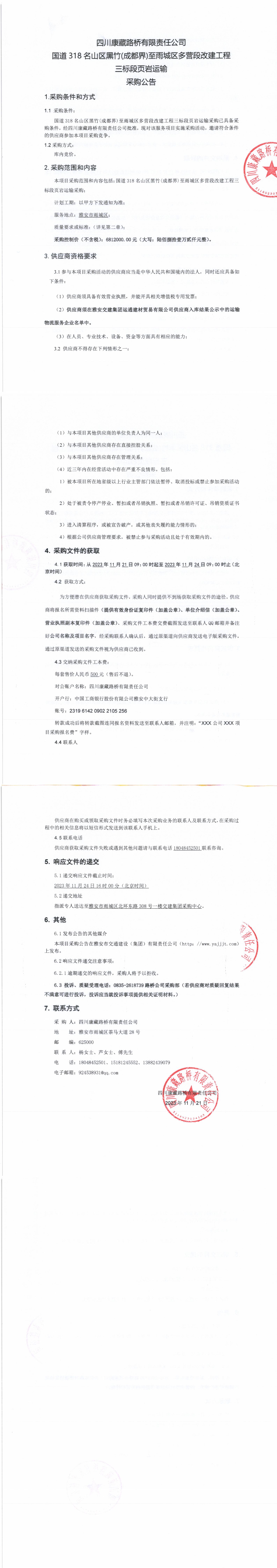 四川康藏路橋有限責(zé)任公司國道318名山區(qū)黑竹(成都界)至雨城區(qū)多營段改建工程三標(biāo)段頁巖運(yùn)輸采購公告