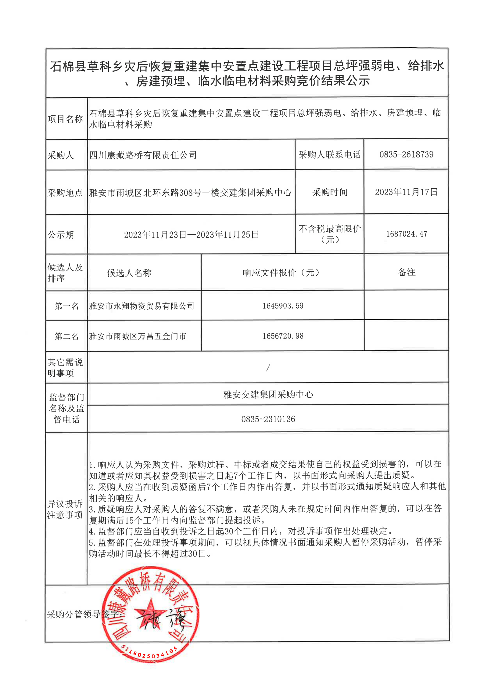 四川康藏路橋有限責(zé)任公司石棉縣草科鄉(xiāng)災(zāi)后恢復(fù)重建集中安置點(diǎn)建設(shè)工程項(xiàng)目總坪強(qiáng)弱電、給排水、房建預(yù)埋、臨水臨電材料采購(gòu)結(jié)果公示
