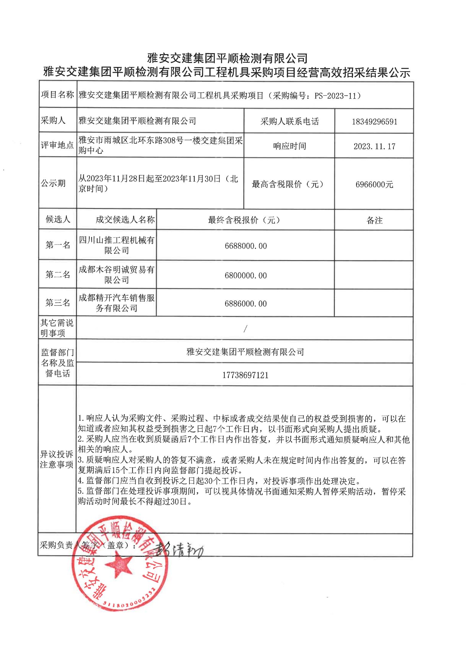 雅安交建集團(tuán)平順檢測有限公司工程機具采購項目經(jīng)營高效招采結(jié)果公示