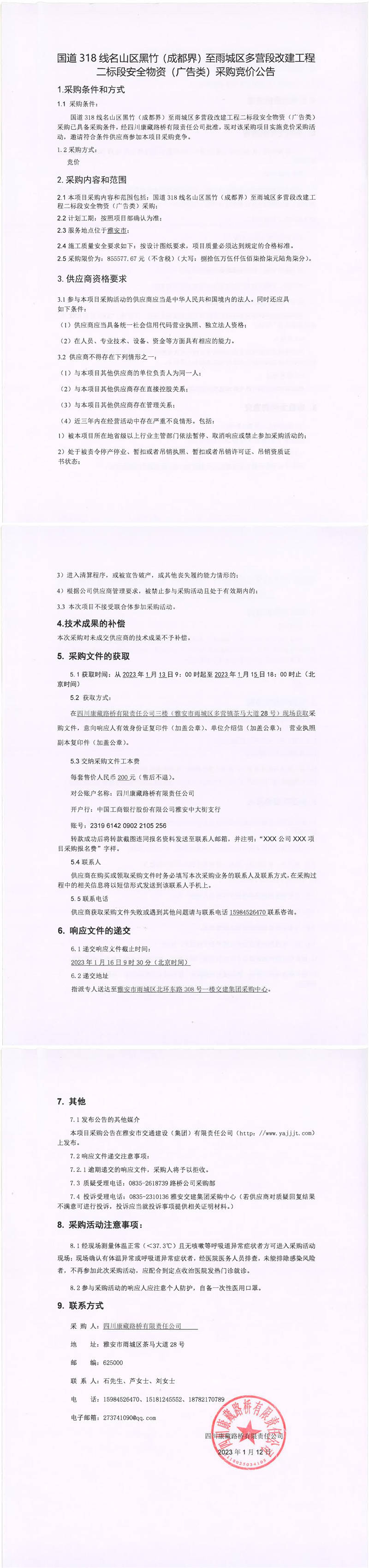 四川康藏路橋有限責(zé)任公司國(guó)道318線名山區(qū)黑竹(成都界)至雨城區(qū)多營(yíng)段改建工程二標(biāo)段安全物資(廣告類)采購(gòu)競(jìng)價(jià)公告