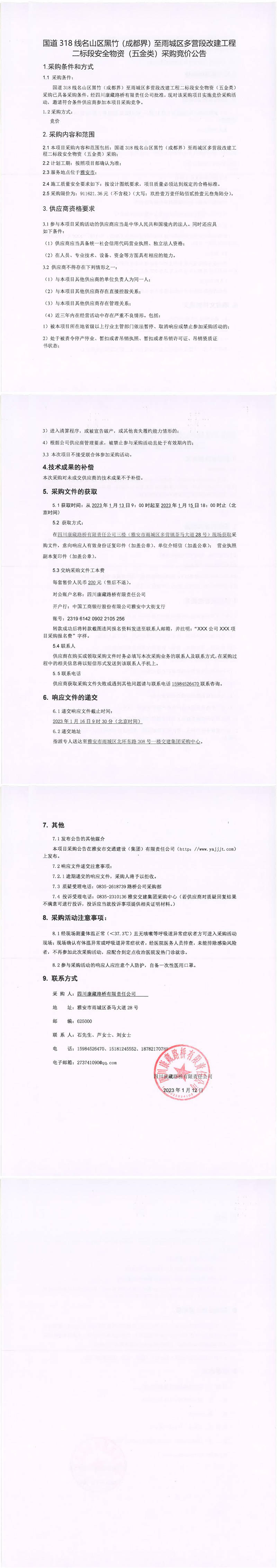 四川康藏路橋有限責(zé)任公司國(guó)道318線名山區(qū)黑竹(成都界)至雨城區(qū)多營(yíng)段改建工程二標(biāo)段安全物資(五金類(lèi))采購(gòu)競(jìng)價(jià)公告