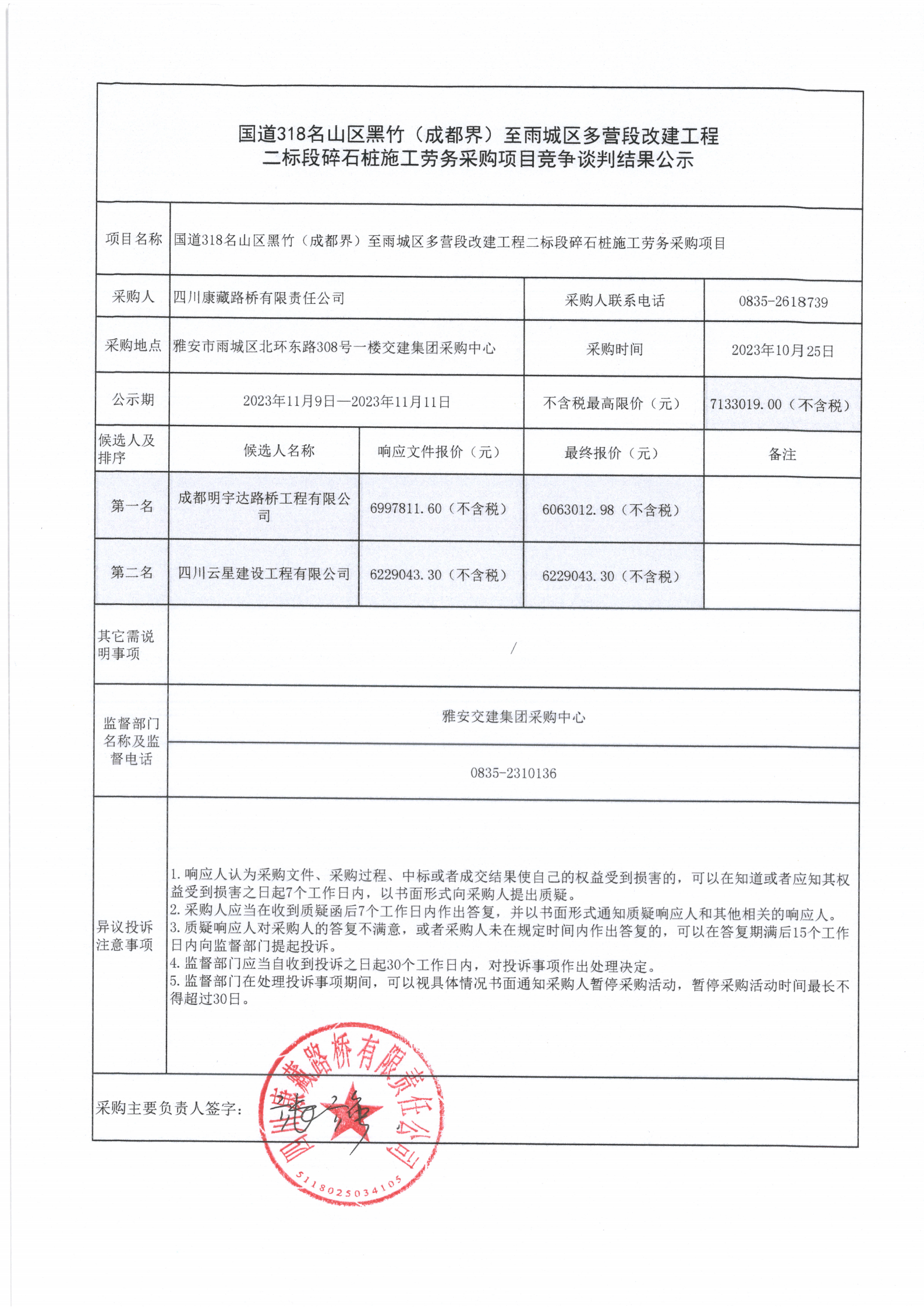 四川康藏路橋有限責(zé)任公司國道318名山區(qū)黑竹(成都界)至雨城區(qū)多營(yíng)段改建工程二標(biāo)段碎石樁施工勞務(wù)采購項(xiàng)目競(jìng)爭(zhēng)談判結(jié)果公示