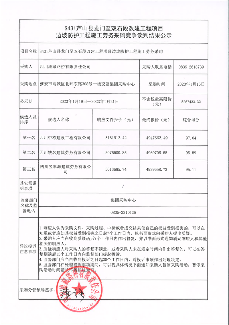 四川康藏路橋有限責(zé)任公司S431蘆山縣龍門至雙石段改建工程項目邊坡防護(hù)工程施工勞務(wù)采購競爭談判結(jié)果公示