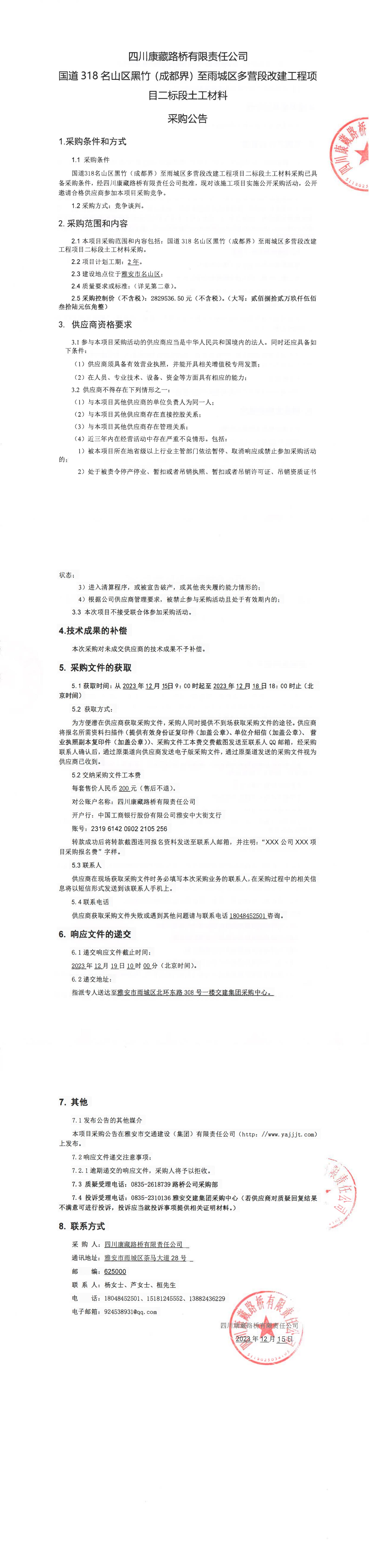 四川康藏路橋有限責(zé)任公司國(guó)道318名山區(qū)黑竹(成都界)至雨城區(qū)多營(yíng)段改建工程項(xiàng)目二標(biāo)段土工材料采購(gòu)公告