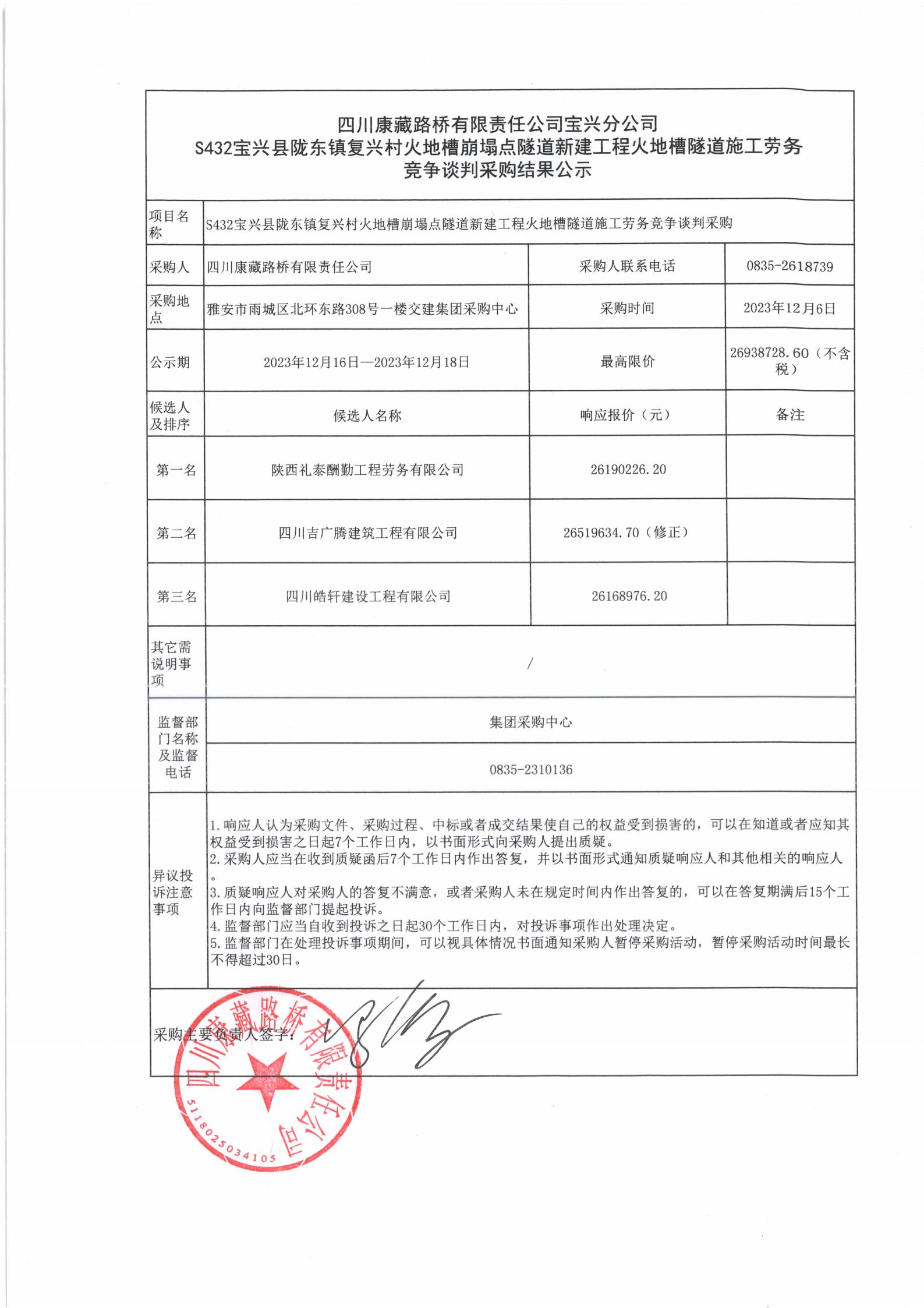 四川康藏路橋有限責任公司寶興分公司S432寶興縣隴東鎮(zhèn)復興村火地槽崩塌點隧道新建工程火地槽隧道施工勞務競爭談判采購結果公示