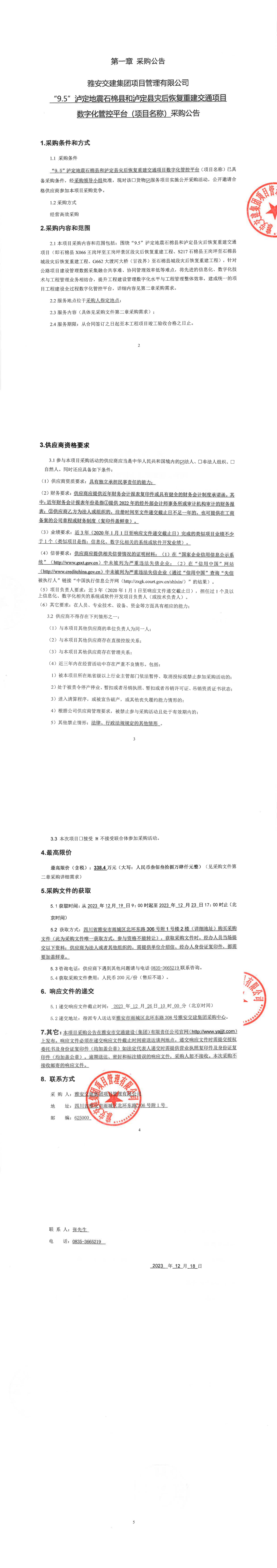 雅安交建集團(tuán)項(xiàng)目管理有限公司“9.5”瀘定地震石棉縣和瀘定縣災(zāi)后恢復(fù)重建交通項(xiàng)目數(shù)字化管控平臺(項(xiàng)目名稱)采購公告
