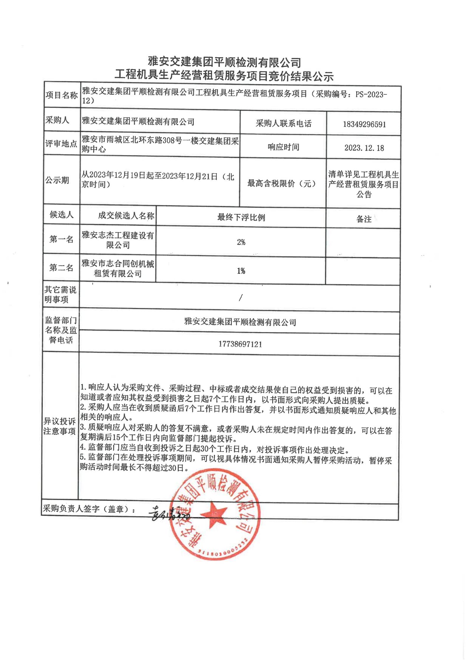 雅安交建集團平順檢測有限公司工程機具生產經營租賃服務項目競價結果公示