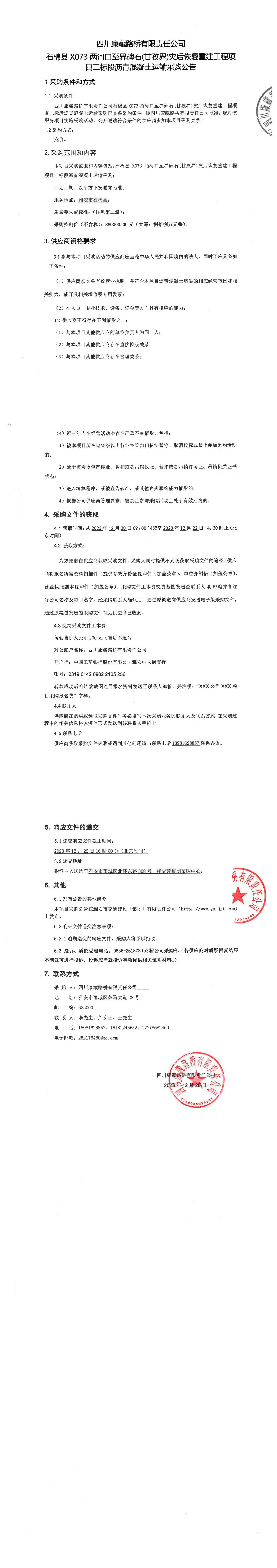 四川康藏路橋有限責(zé)任公司石棉縣X073兩河口至界碑石(甘孜界)災(zāi)后恢復(fù)重建工程項(xiàng)目二標(biāo)段瀝青混凝土運(yùn)輸采購(gòu)公告