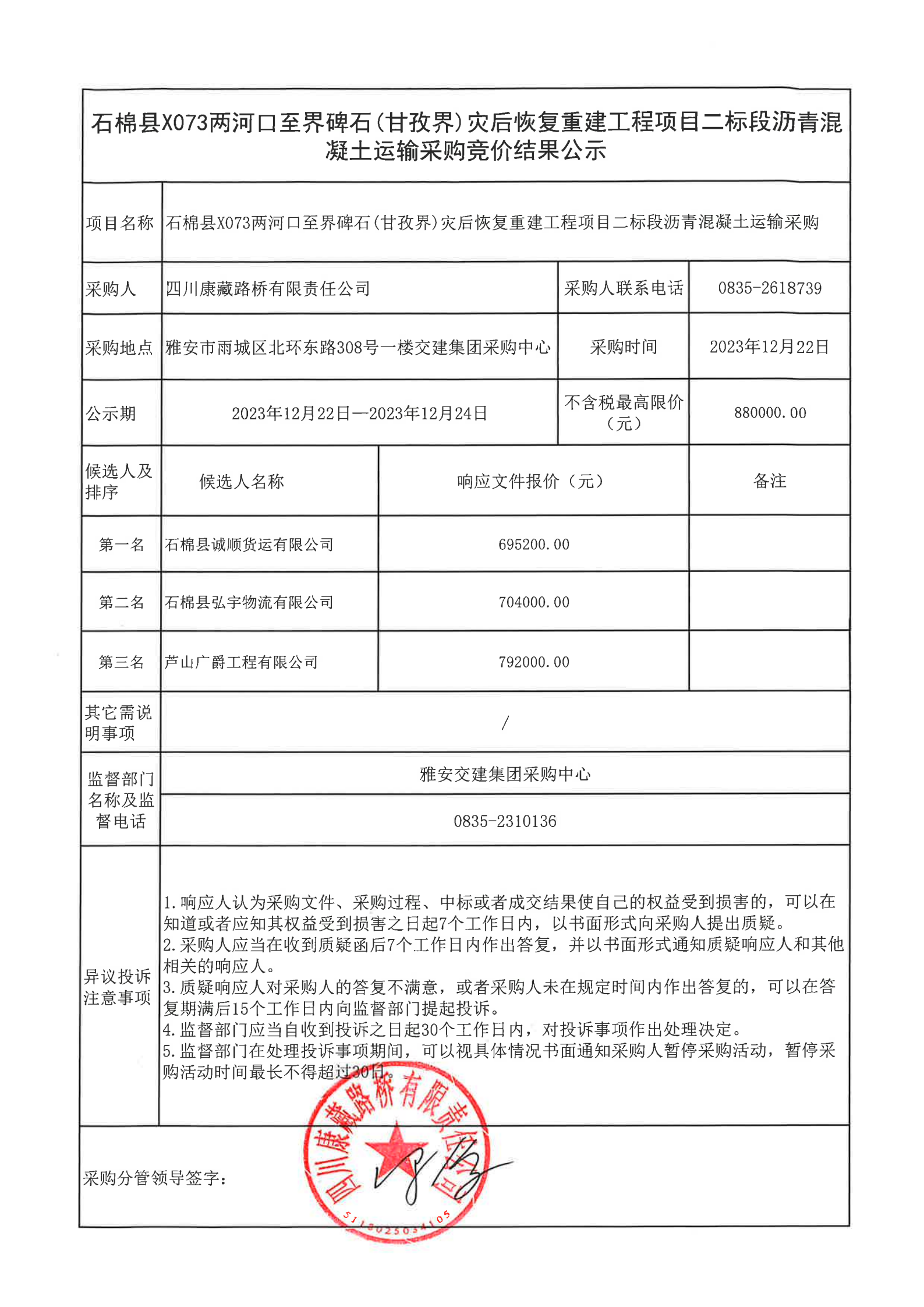 四川康藏路橋有限責任公司石棉縣 X073 兩河口至界碑石(甘孜界)災后恢復重建工程項目二標段瀝青混凝土運輸采購競價結果公示