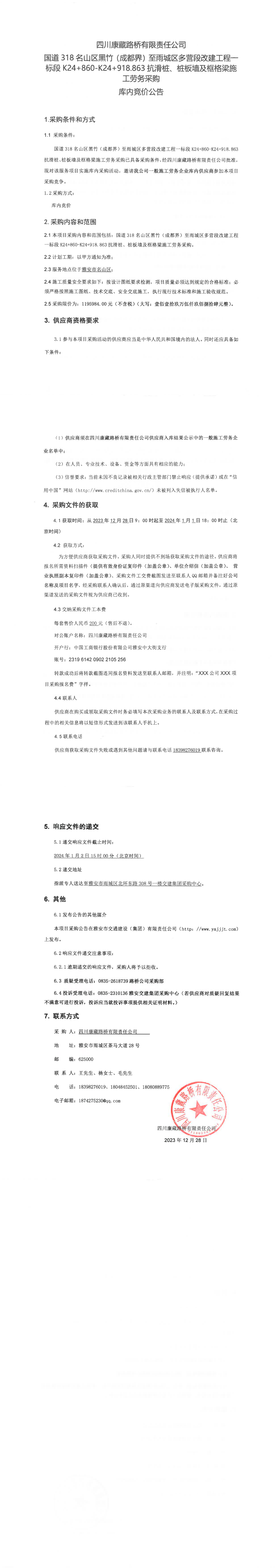 四川康藏路橋有限責(zé)任公司國道318名山區(qū)黑竹(成都界)至雨城區(qū)多營段改建工程一標段K24+860-K24+918.863抗滑樁、樁板墻及框格梁施工勞務(wù)采購庫內(nèi)競價公告