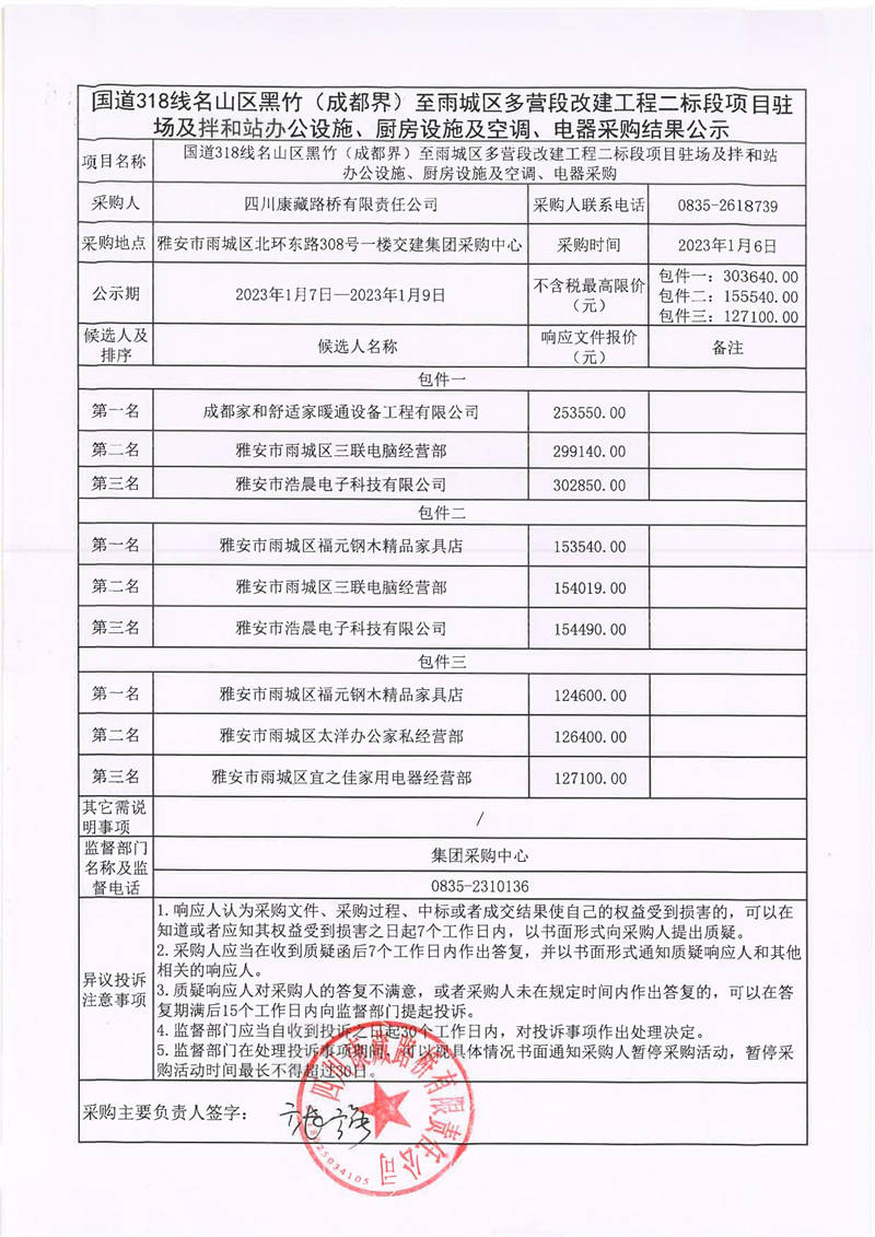四川康藏路橋有限責任公司國道318線名山區(qū)黑竹(成都界)至雨城區(qū)多營段改建工程二標段項目駐場及拌和站辦公設(shè)施、廚房設(shè)施及空調(diào)、電器采購結(jié)果公示