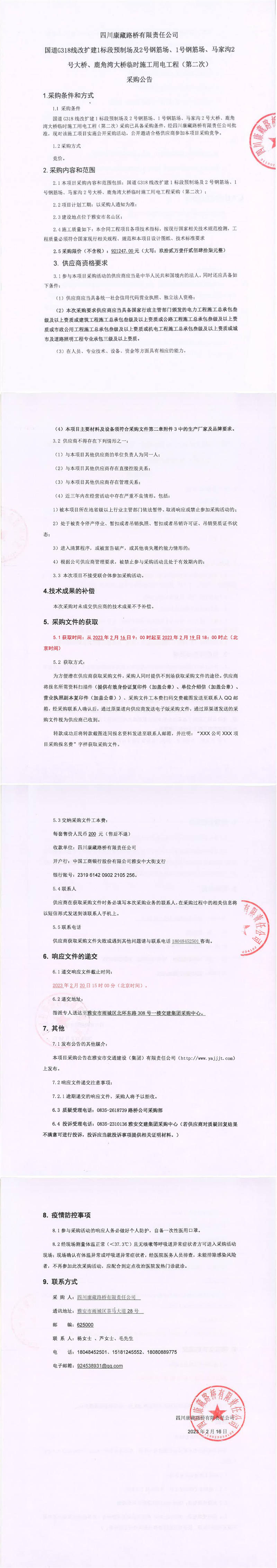 四川康藏路橋有限責(zé)任公司國(guó)道G318線改擴(kuò)建1標(biāo)段預(yù)制場(chǎng)及2號(hào)鋼筋場(chǎng)、1號(hào)鋼筋場(chǎng)、馬家溝2號(hào)大橋、鹿角灣大橋臨時(shí)施工用電工程(第二次)采購(gòu)公告