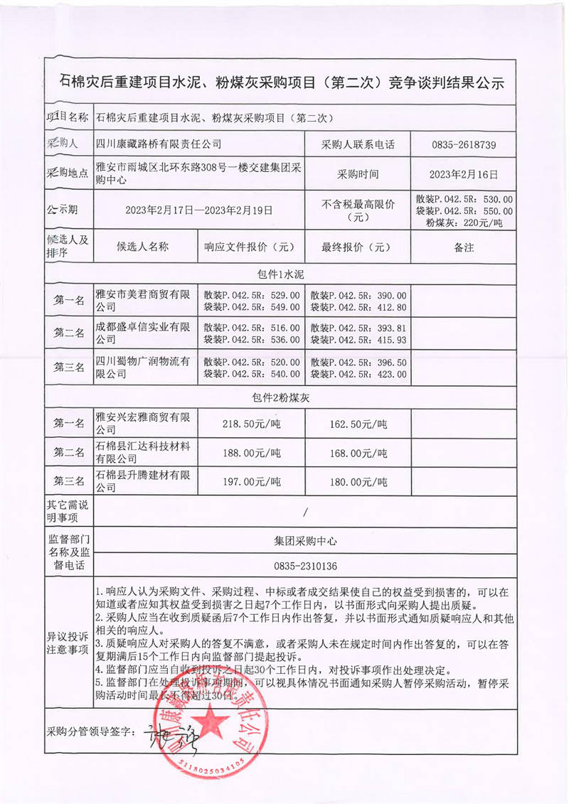 四川康藏路橋有限責(zé)任公司石棉災(zāi)后重建項(xiàng)目水泥、粉煤灰采購(gòu)項(xiàng)目(第二次)競(jìng)爭(zhēng)談判結(jié)果公示
