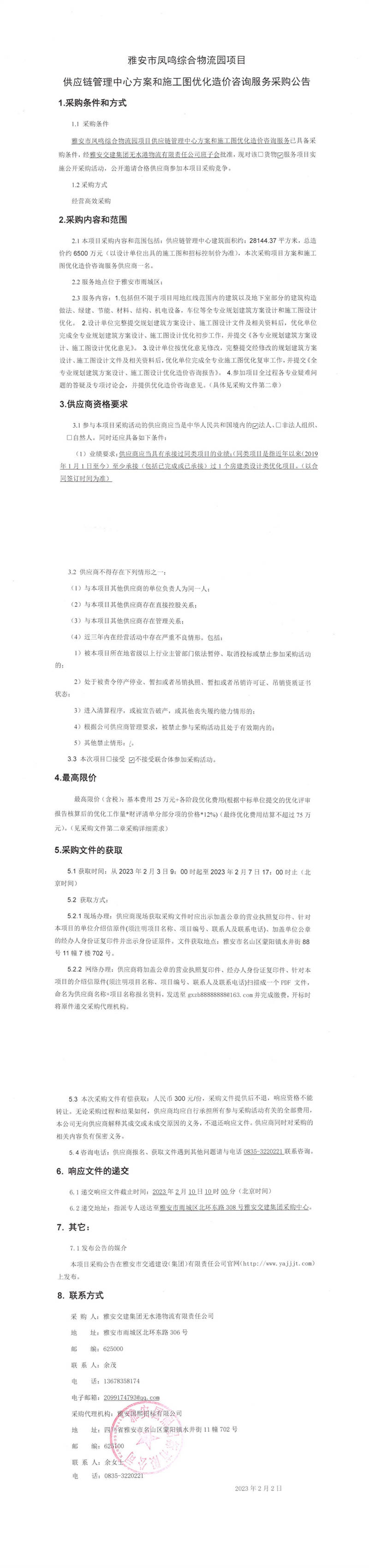 雅安交建集團(tuán)無水港物流有限責(zé)任公司雅安市鳳鳴綜合物流園項(xiàng)目供應(yīng)鏈管理中心方案和施工圖優(yōu)化造價(jià)咨詢服務(wù)采購(gòu)公告