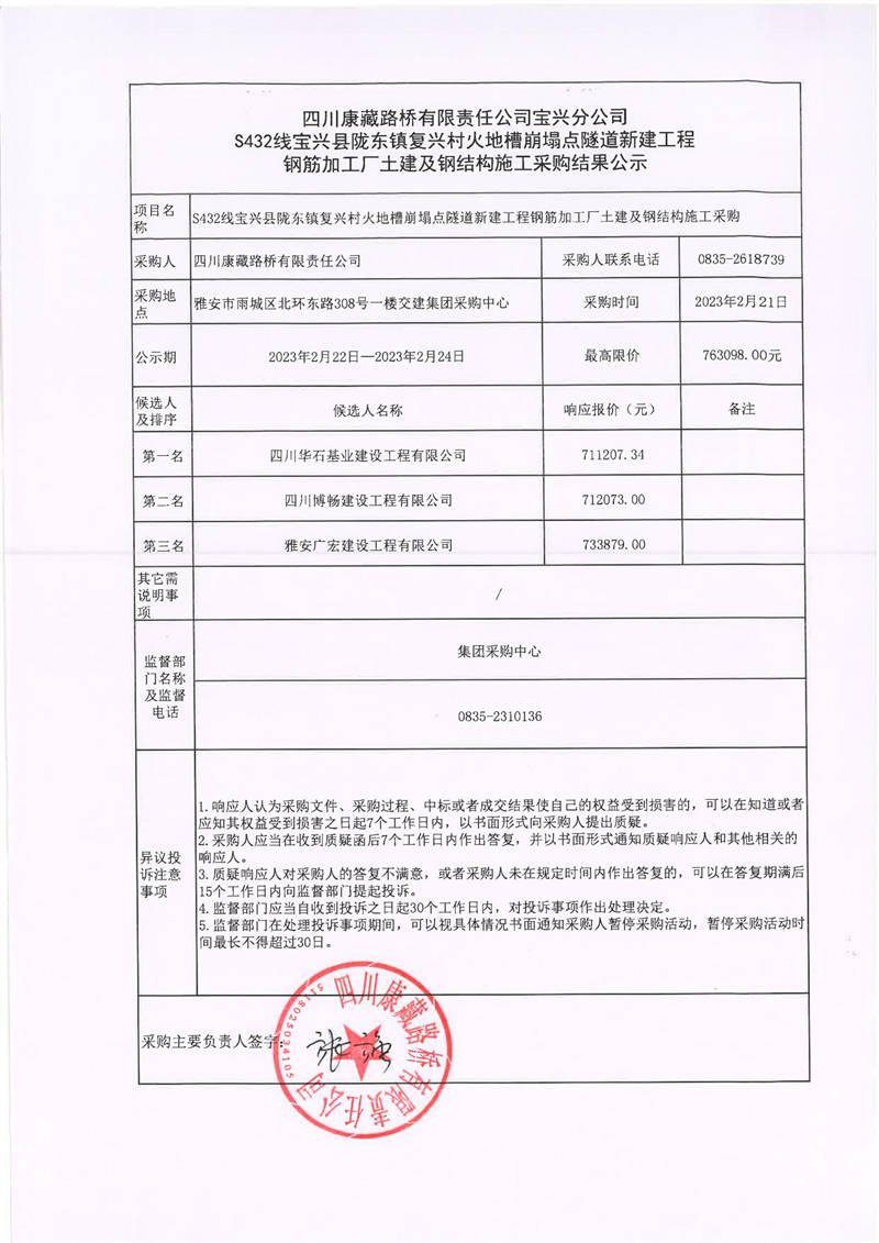 四川康藏路橋有限責任公司寶興分公司S432寶興縣隴東鎮(zhèn)復(fù)興村火地槽崩塌點隧道新建工程鋼筋加工廠土建及鋼結(jié)構(gòu)施工采購結(jié)果公示