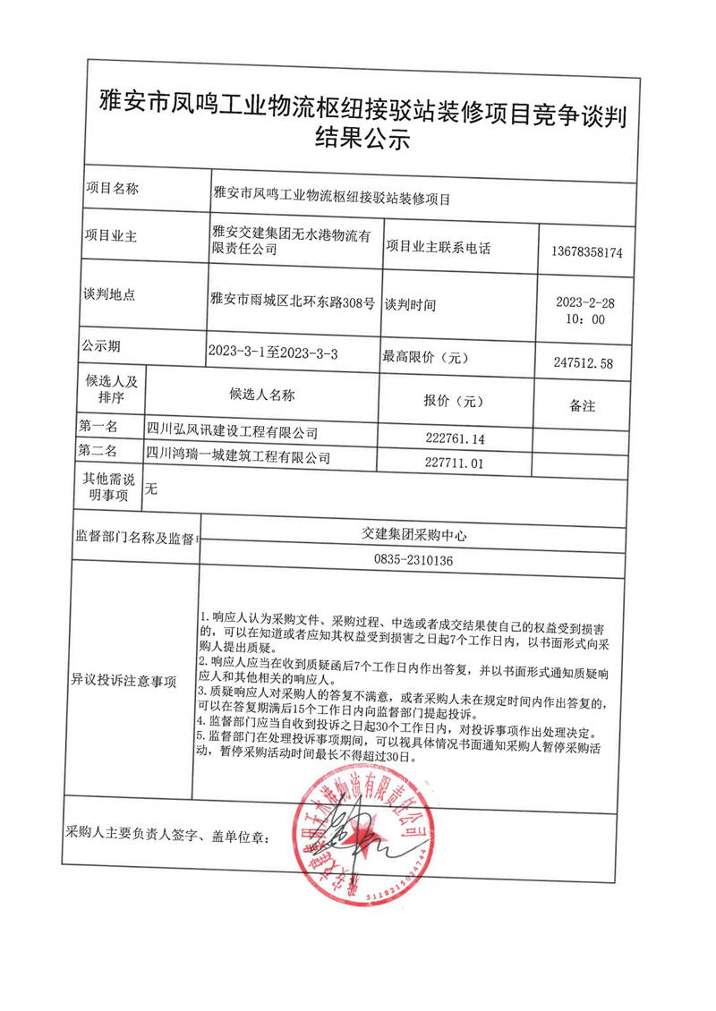 雅安交建集團無水港物流有限責任公司雅安市鳳鳴工業(yè)物流樞紐接駁站裝修項目競爭談判結果公示