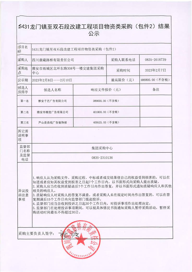 四川康藏路橋有限責(zé)任公司S431龍門鎮(zhèn)至雙石段改建工程項(xiàng)目物資類采購(gòu)(包件1、包件2)結(jié)果公示