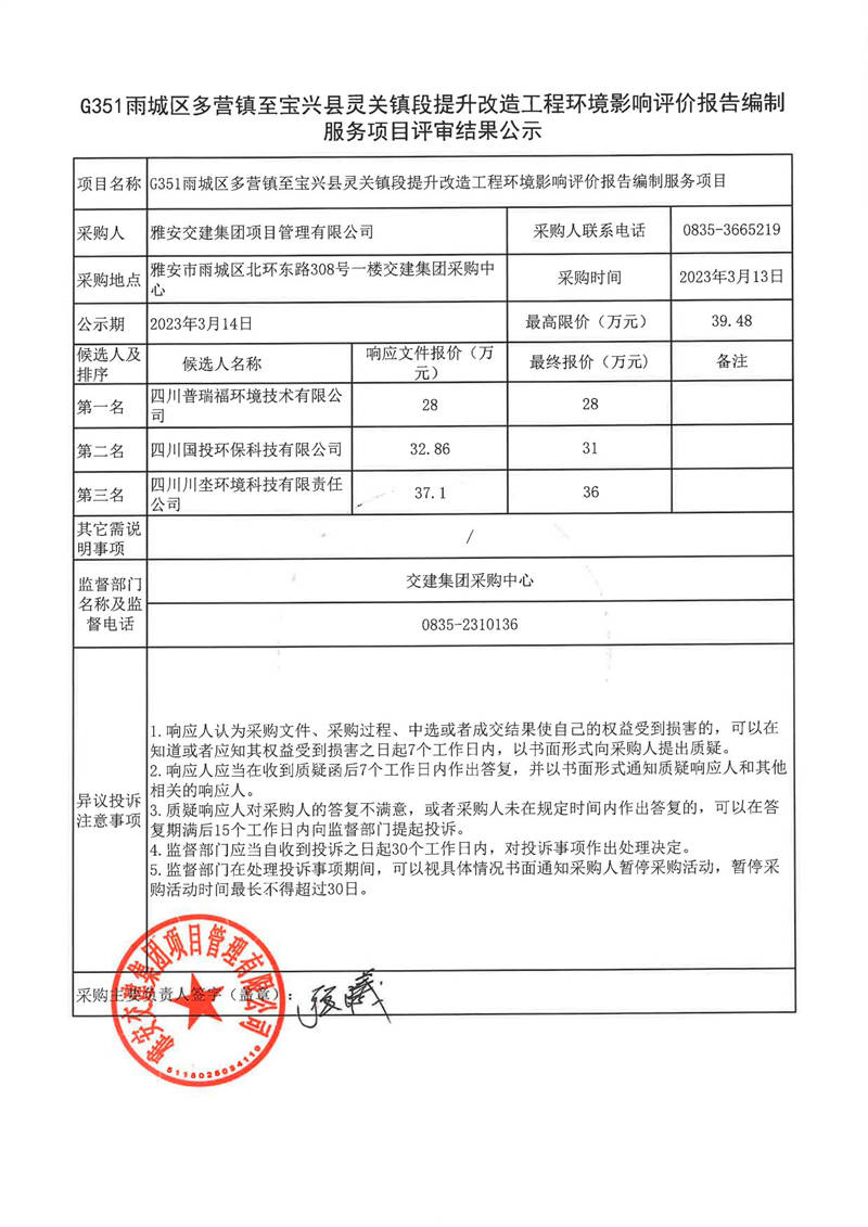 雅安交建集團項目管理有限公司G351雨城區(qū)多營鎮(zhèn)至寶興縣靈關(guān)鎮(zhèn)段提升改造工程環(huán)境影響評價報告編制服務(wù)項目結(jié)果公示