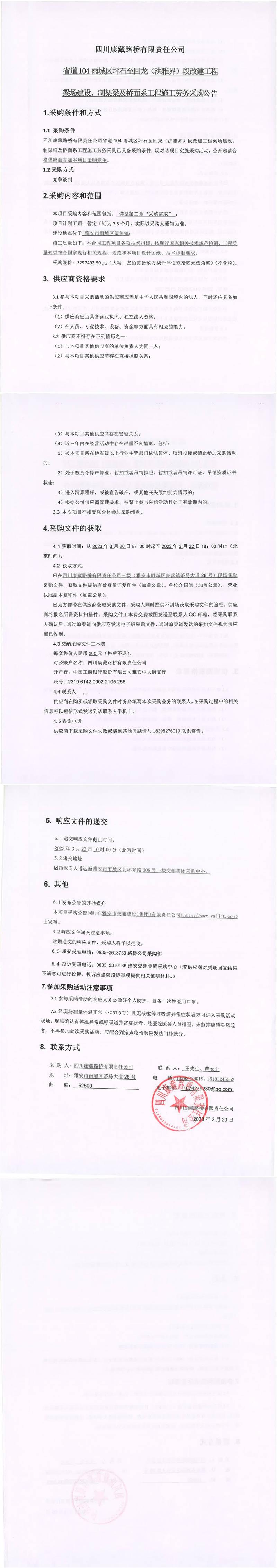 四川康藏路橋有限責任公司省道104雨城區(qū)坪石至回龍(洪雅界)段改建工程梁場建設(shè)、制架梁及橋面系工程施工勞務(wù)采購公告